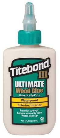 Titebond III Ultimate Wood Glue is the first one-part, water cleanup wood glue ever offered that is proven waterproof. The waterproof formula passes the ANSI/HPVA Type I water-resistance specification and offers superior bond strength, longer open assembly time and lower application temperature. Titebond III is non-toxic, solvent free and cleans up with water safer to use than traditional waterproof wood glues. It provides strong initial tack, sands easily without softening and is FDA approved for indirect food contact (cutting boards). The ultimate in wood glues ideal for both interior and exterior applications.Specifications