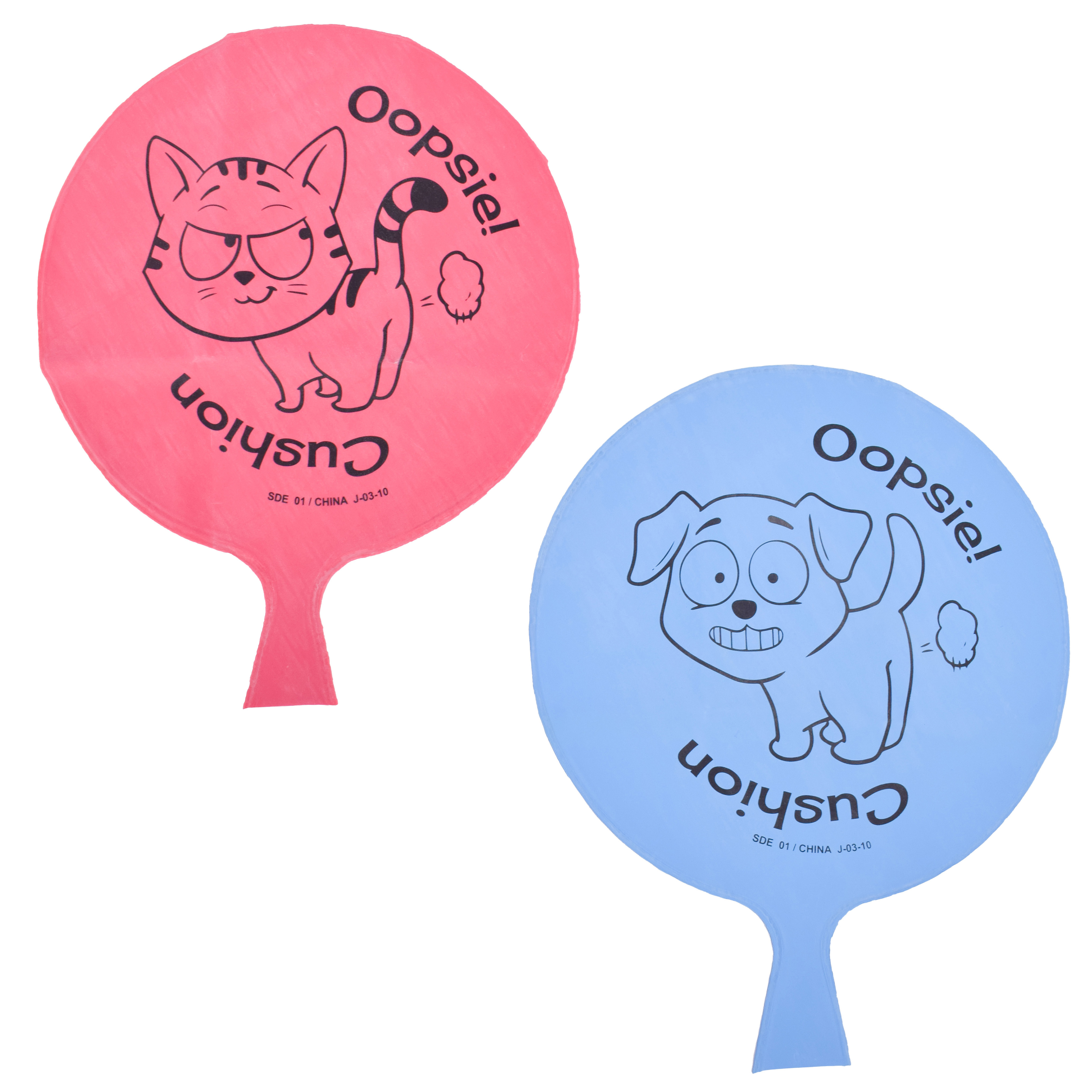 Featuring cute cat and dog designs, the Oopsie Cushion 2 Pack is ready for some fun pranks. A classic toy, these fart cushions make a funny gift for kids and adults of all ages. You're sure to get laughs all around! Just inflate the rubber cushion with air, place on a friend's chair and wait for them to sit down. As they sit, the room will be filled with the sound of someone cutting loose followed by lots of laughter!Specifications