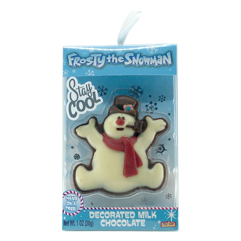 1 oz; Contains Milk, Soy; Decorated chocolate; Frosty the Snowman design; Made with milk chocolate and real cocoa butter; Milk chocolate candy; Packaged in a box with ribbon loop for hanging on a tree; The perfect stocking stuffer