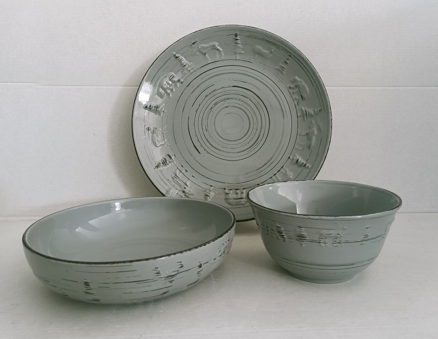 12-PIECE DINNERWARE SET INCLUDES 4 EACH OF: 10 1/2" DINNER PLATE, 7 3/4" PASTA BOWL, 6" ALL PURPOSE BOWL; DISHWASHER AND MICROWAVE SAFE; MADE WITH HIGH QUALITY STONEWARE; PFALTZGRAFF 12PC DINNERWARE SET; TRELLIS LODGE