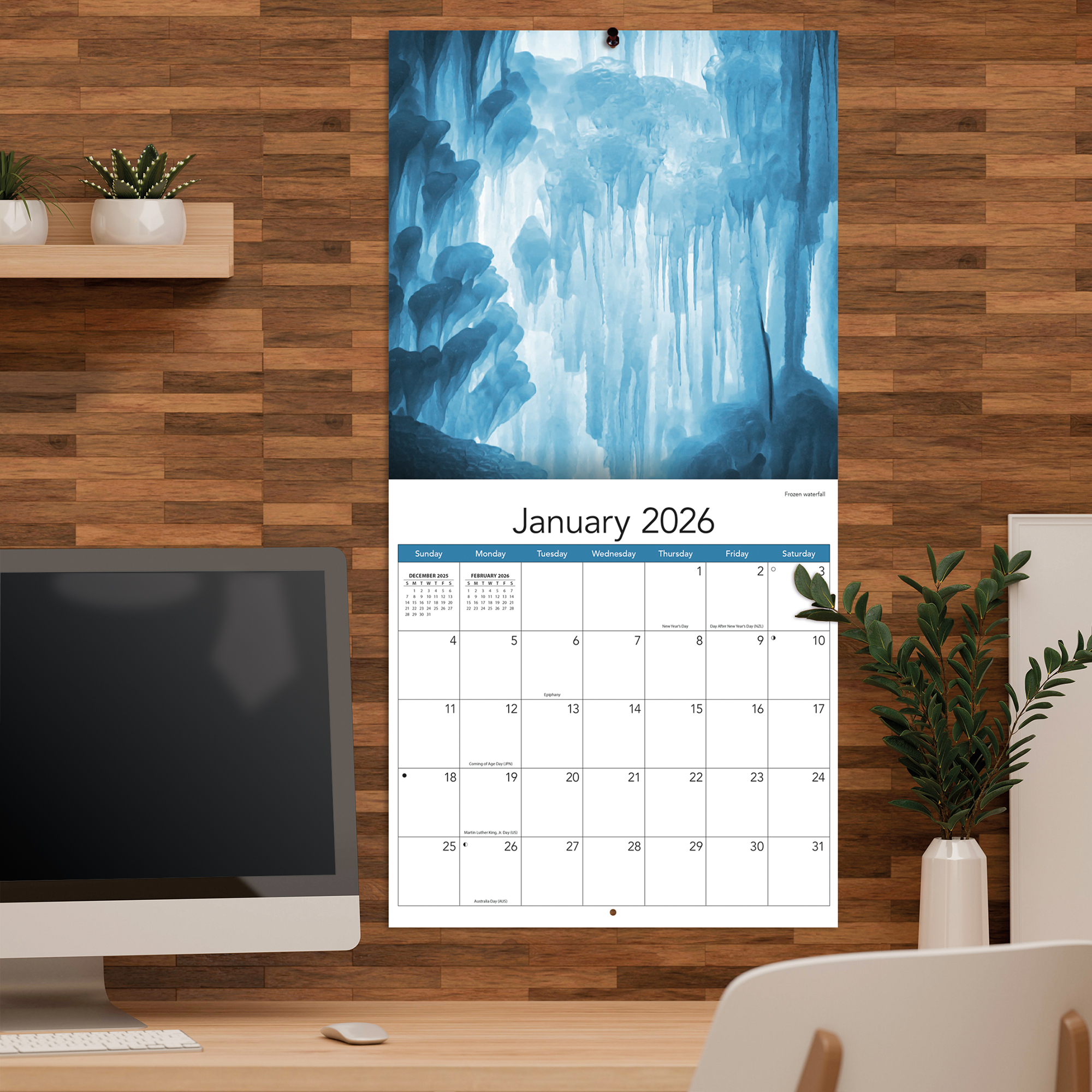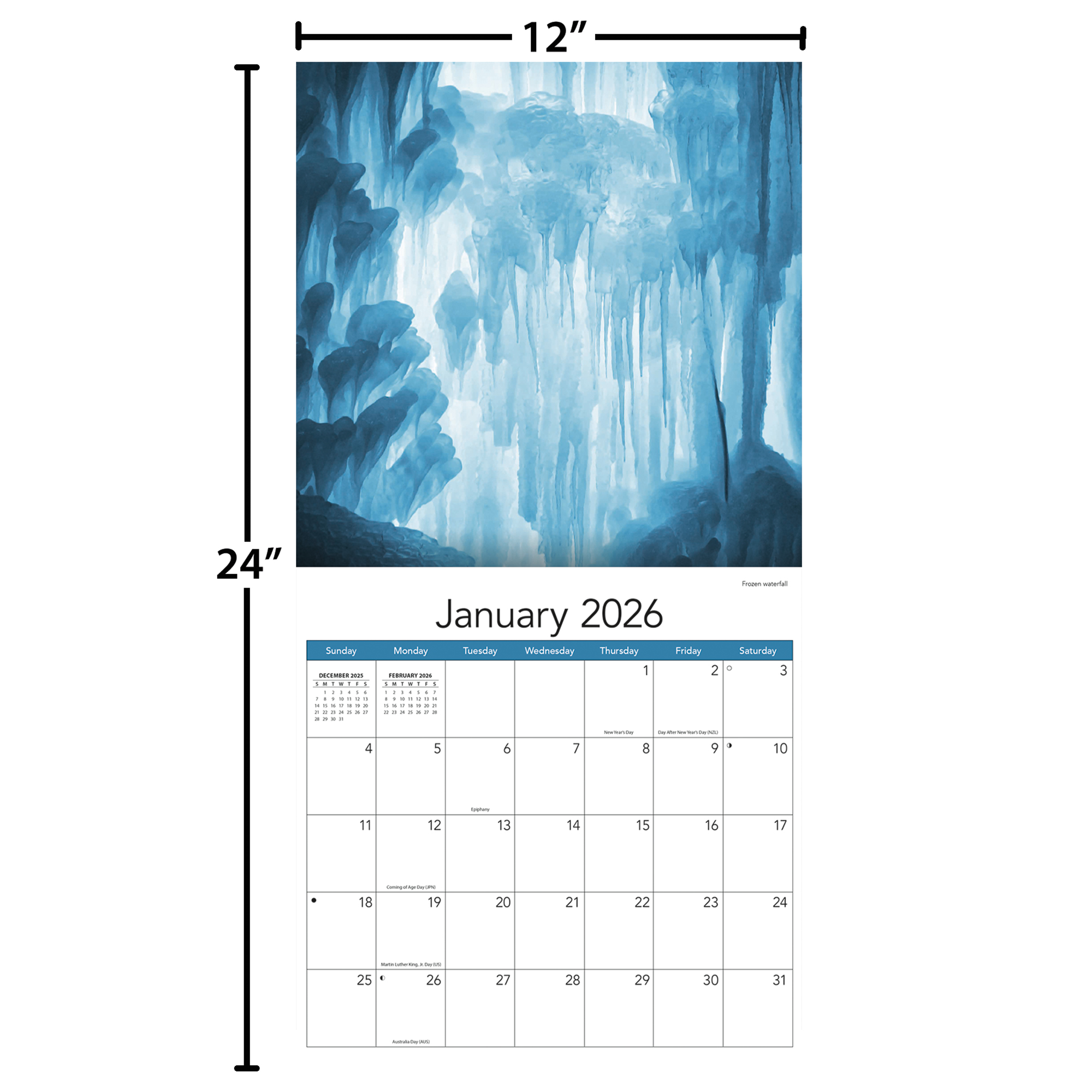12"w x 24"h (opened); 12-month format (January - December 2026); Bonus page featuring September - December 2025; Calendar is plastic-free & 100% recyclable; Printed with soy ink