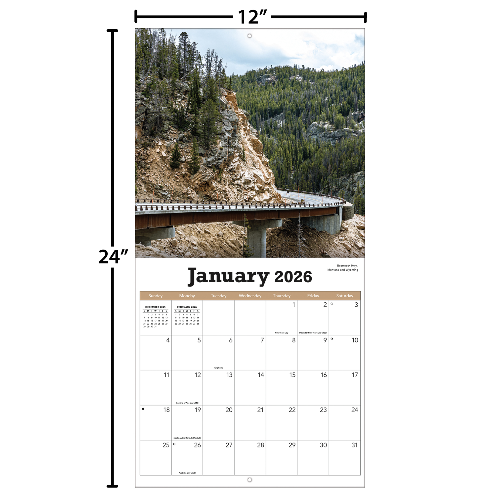12"w x 24"h (opened); 12-month format (January - December 2026); Bonus page featuring September - December 2025; Calendar is plastic-free & 100% recyclable; Printed with soy ink