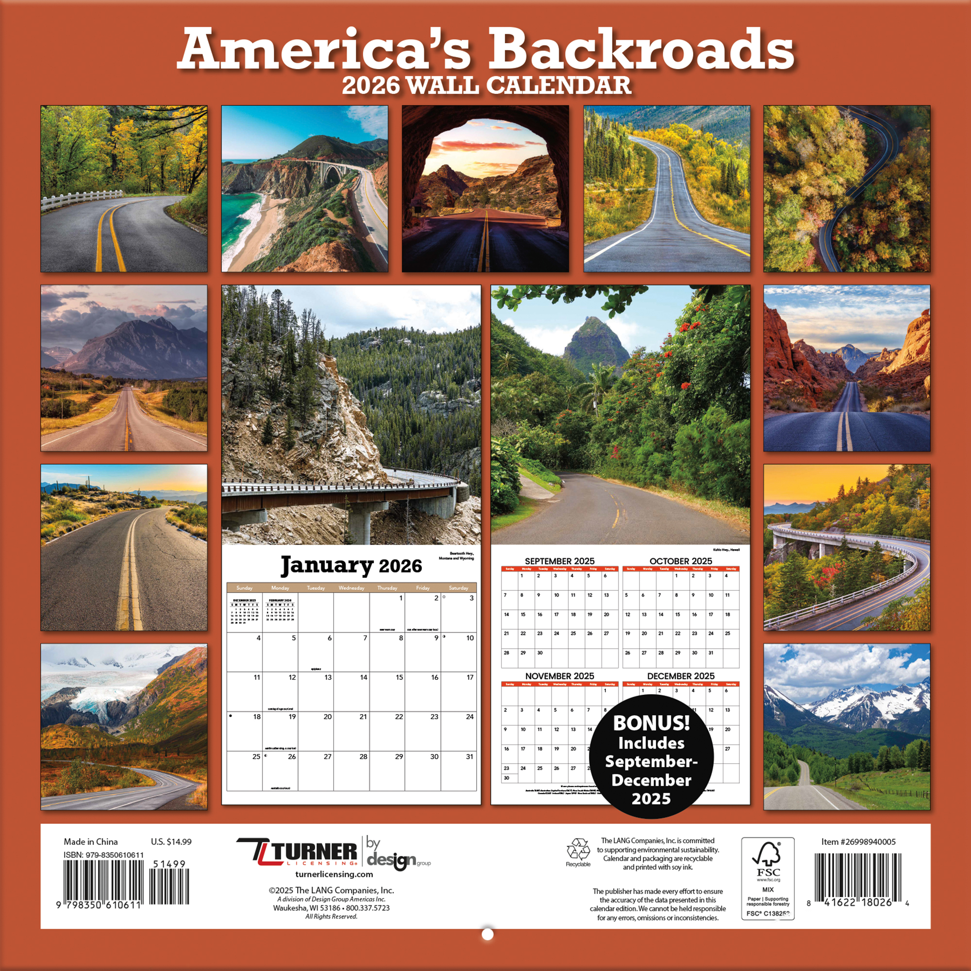With a reputation for premium-quality calendars featuring exquisite photography and art, Turner Photographic Wall Calendars have something for everyone. All Turner Photographic Wall Calendars are plastic-free and 100% recyclable, printed on responsibly sourced FSC paper using soy ink.Specifications