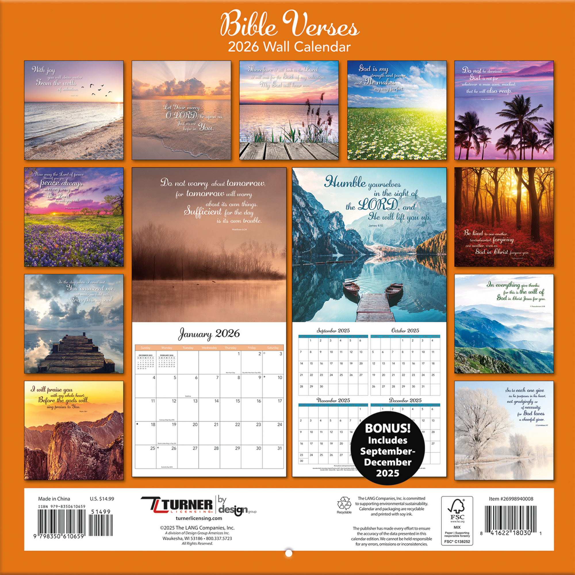 With a reputation for premium-quality calendars featuring exquisite photography and art, Turner Photographic Wall Calendars have something for everyone. All Turner Photographic Wall Calendars are plastic-free and 100% recyclable, printed on responsibly sourced FSC paper using soy ink.Specifications