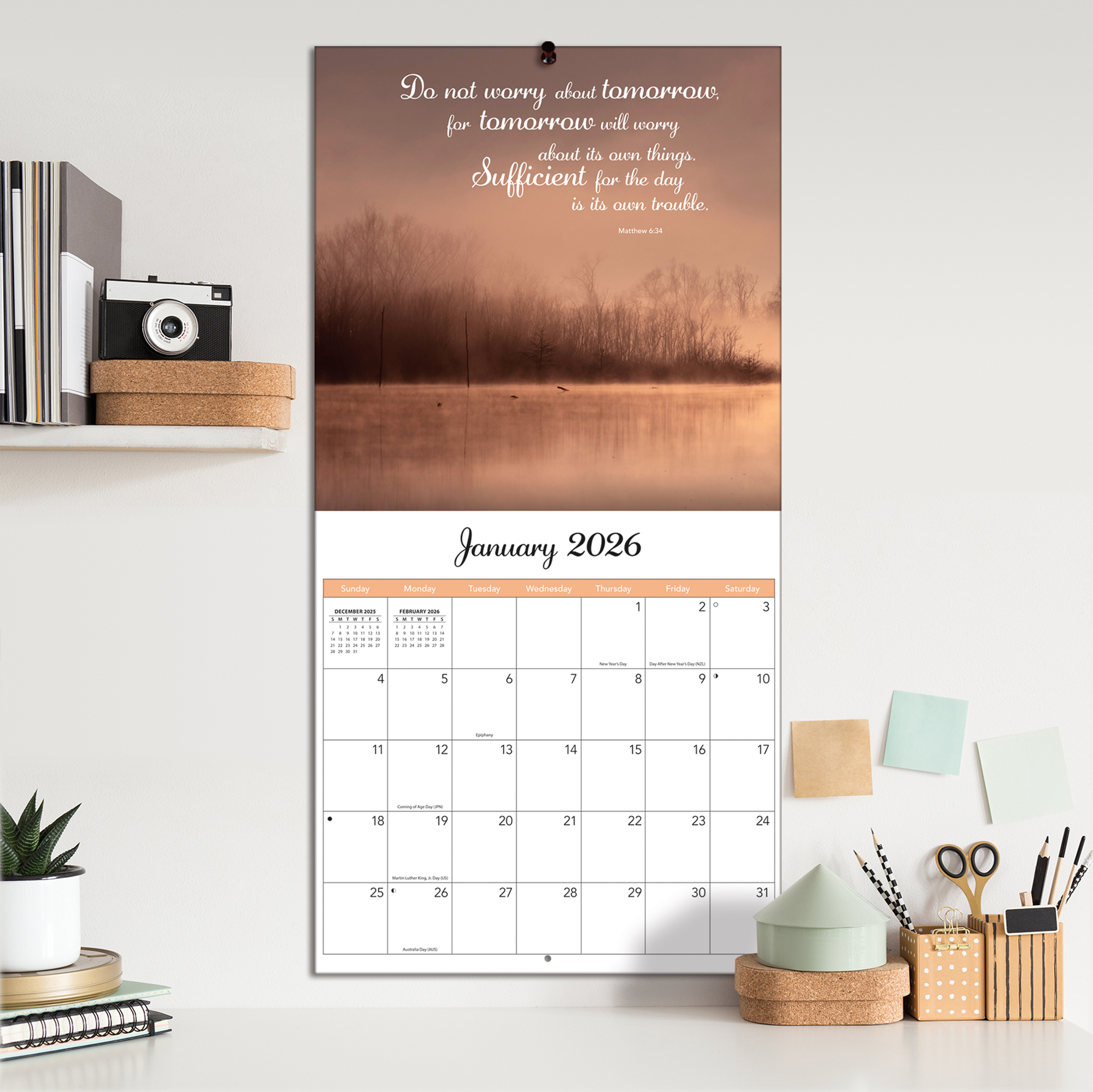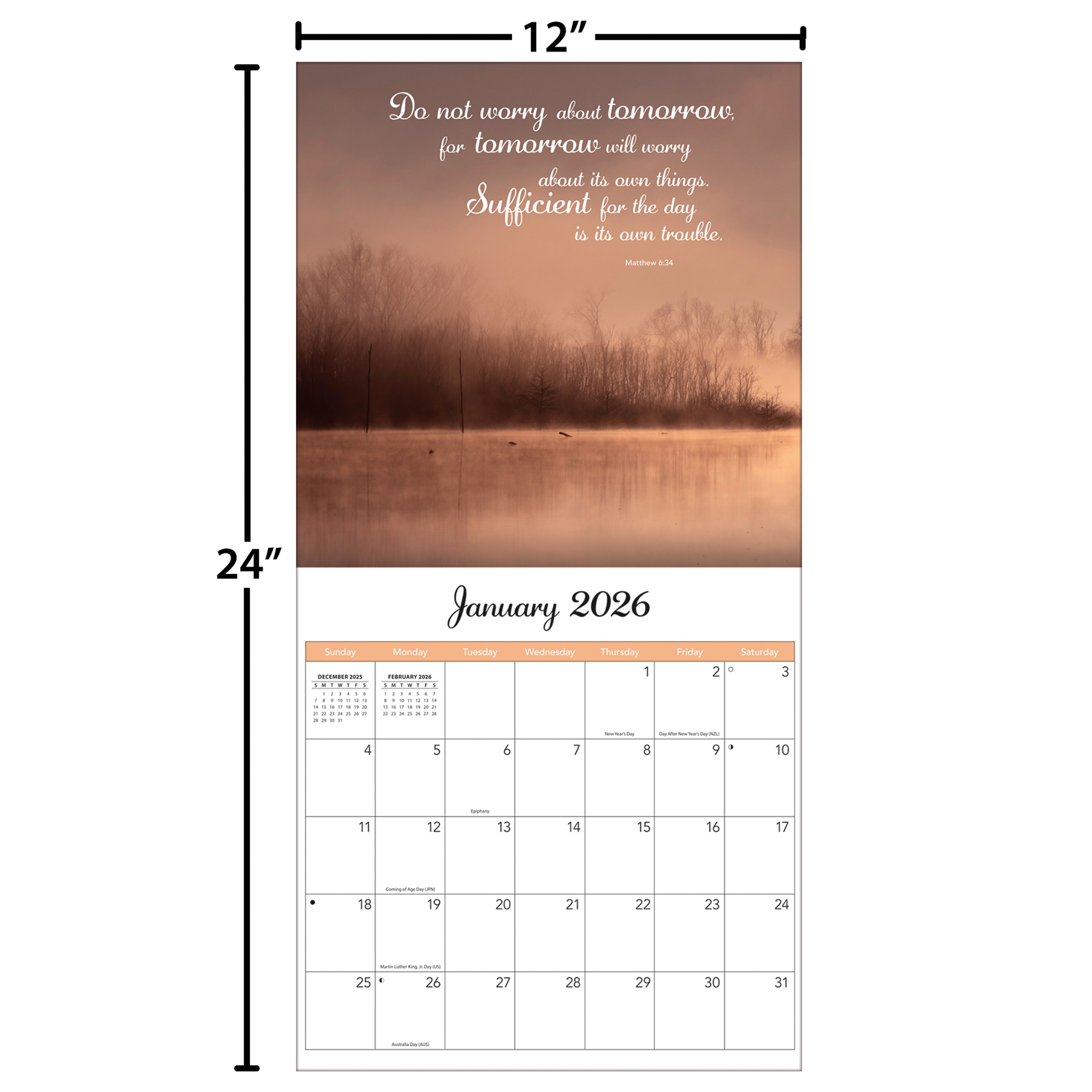 12"w x 24"h (opened); 12-month format (January - December 2026); Bonus page featuring September - December 2025; Calendar is plastic-free & 100% recyclable; Printed with soy ink