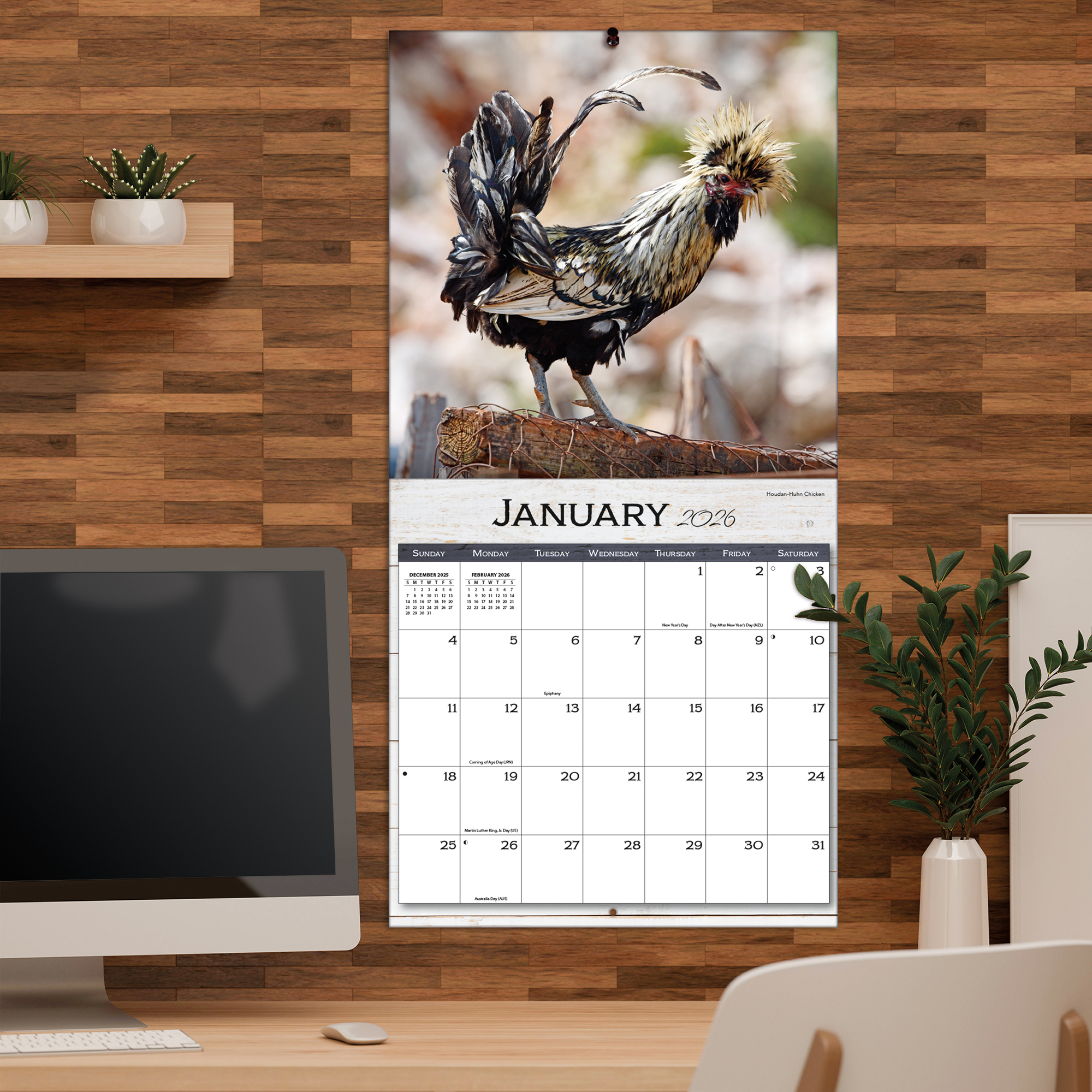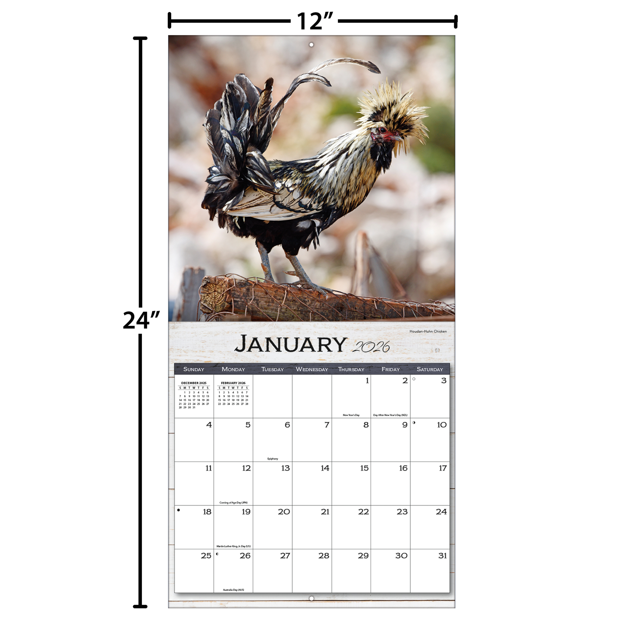 12"w x 24"h (opened); 12-month format (January - December 2026); Bonus page featuring September - December 2025; Calendar is plastic-free & 100% recyclable; Printed with soy ink