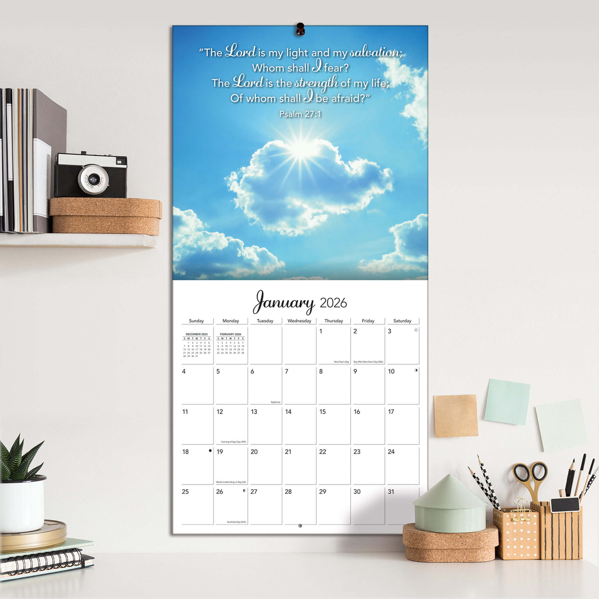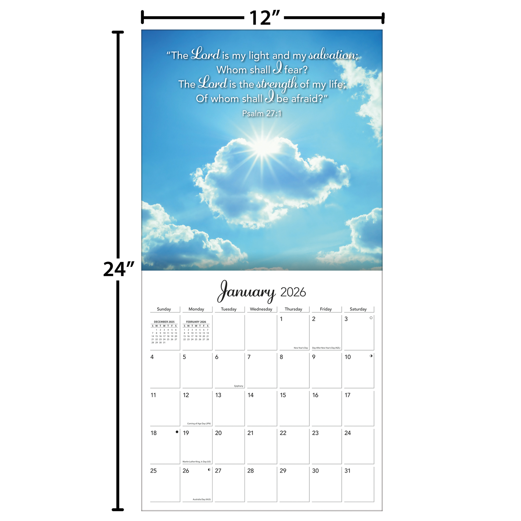 12"w x 24"h (opened); 12-month format (January - December 2026); Bonus page featuring September - December 2025; Calendar is plastic-free & 100% recyclable; Printed with soy ink