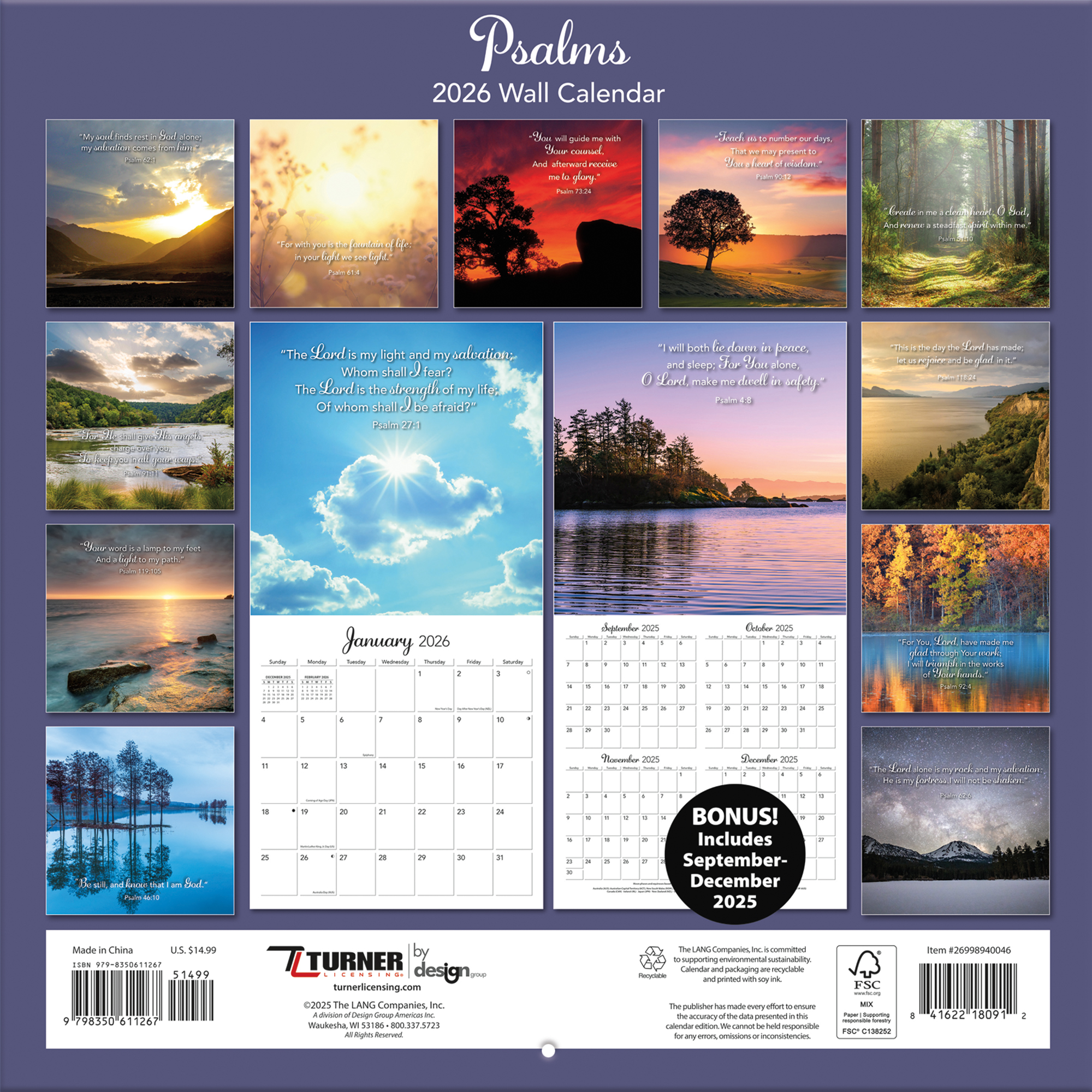 With a reputation for premium-quality calendars featuring exquisite photography and art, Turner Photographic Wall Calendars have something for everyone. All Turner Photographic Wall Calendars are plastic-free and 100% recyclable, printed on responsibly sourced FSC paper using soy ink.Specifications
