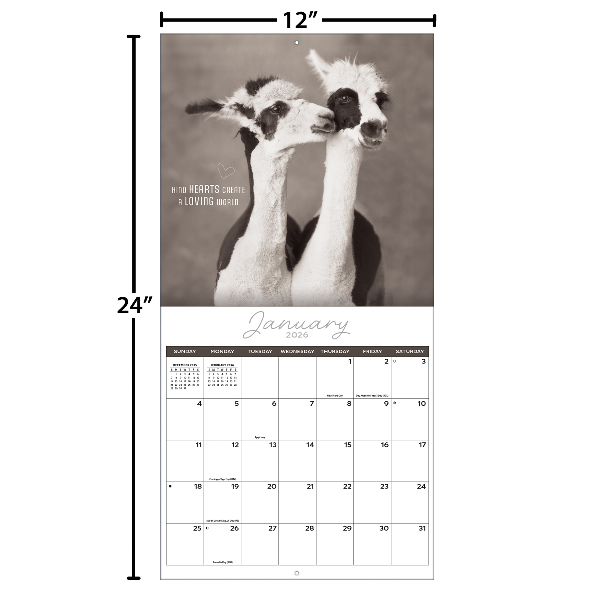 12"w x 24"h (opened); 12-month format (January - December 2026); Bonus page featuring September - December 2025; Calendar is plastic-free & 100% recyclable; Printed with soy ink