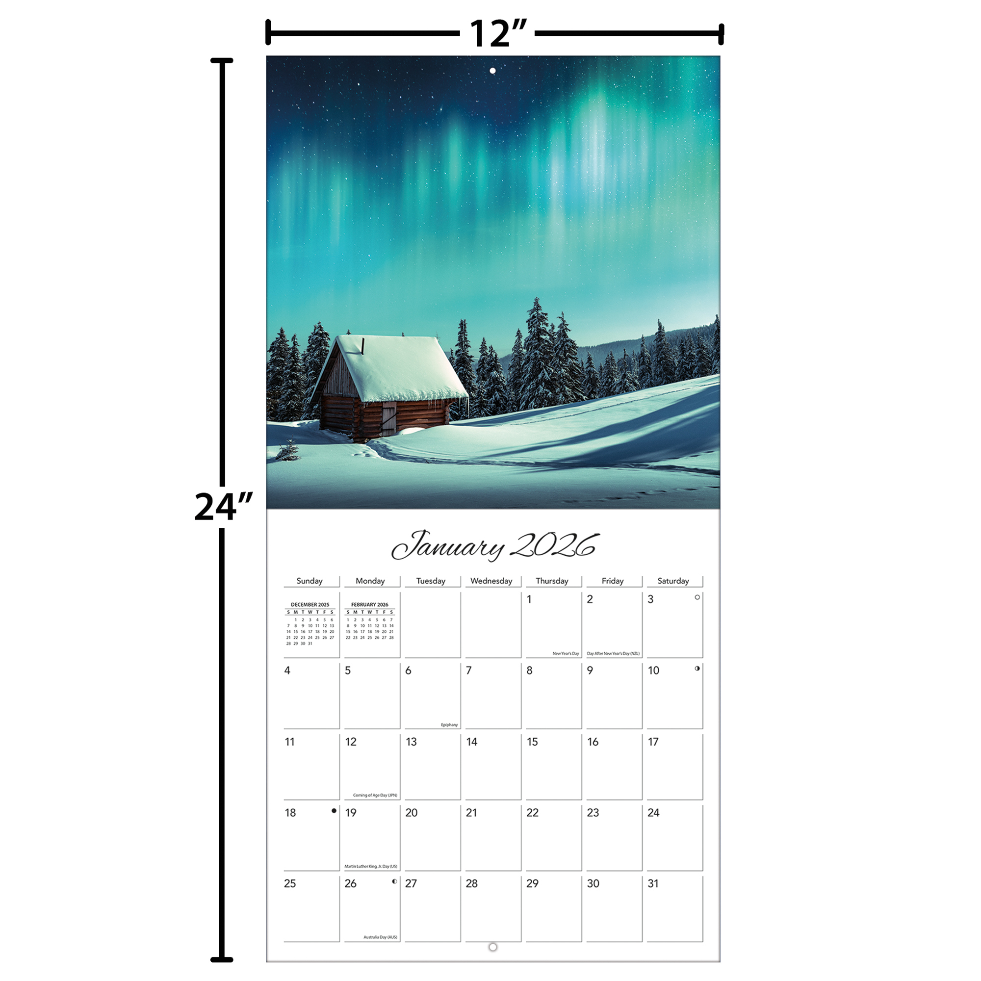 12"w x 24"h (opened); 12-month format (January - December 2026); Bonus page featuring September - December 2025; Calendar is plastic-free & 100% recyclable; Printed with soy ink