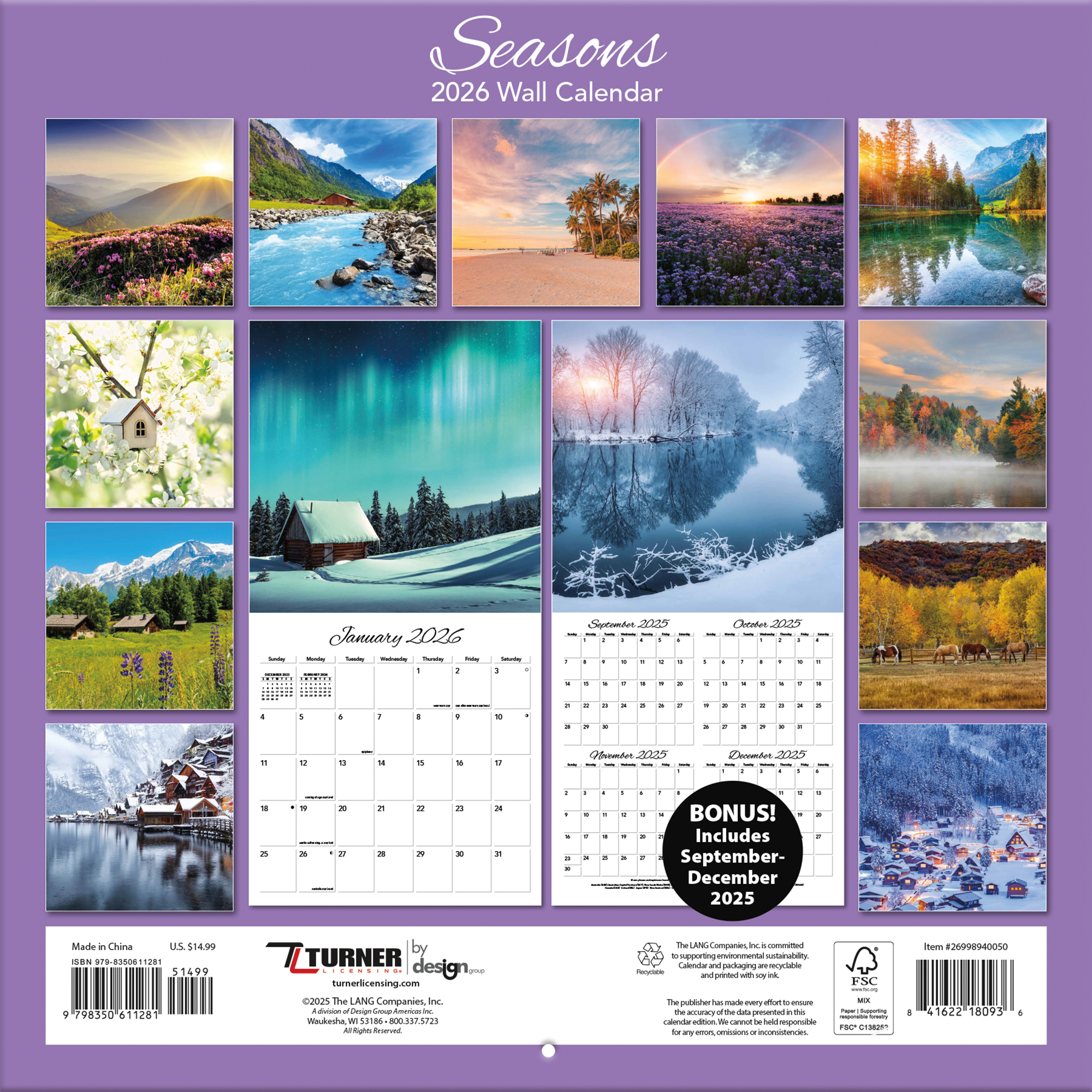 With a reputation for premium-quality calendars featuring exquisite photography and art, Turner Photographic Wall Calendars have something for everyone. All Turner Photographic Wall Calendars are plastic-free and 100% recyclable, printed on responsibly sourced FSC paper using soy ink.Specifications