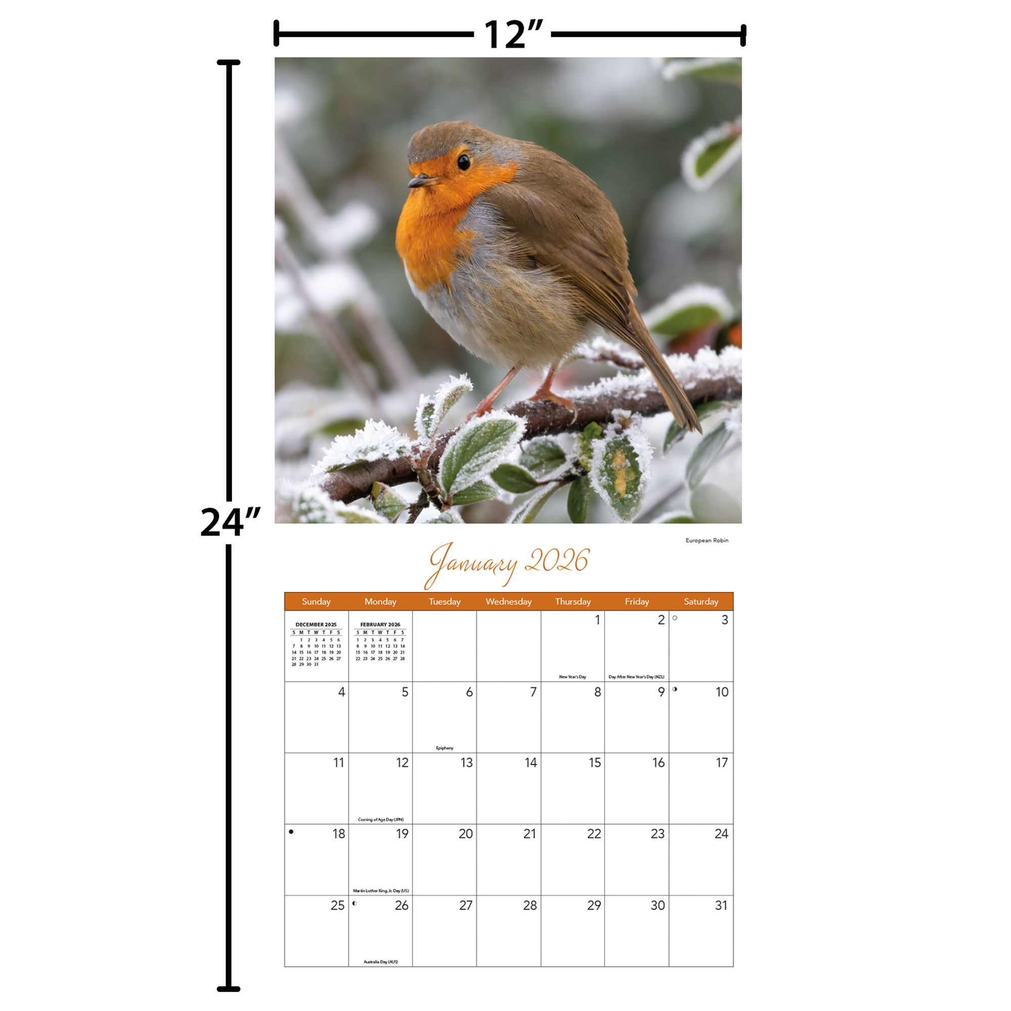 12"w x 24"h (opened); 12-month format (January - December 2026); Bonus page featuring September - December 2025; Calendar is plastic-free & 100% recyclable; Printed with soy ink