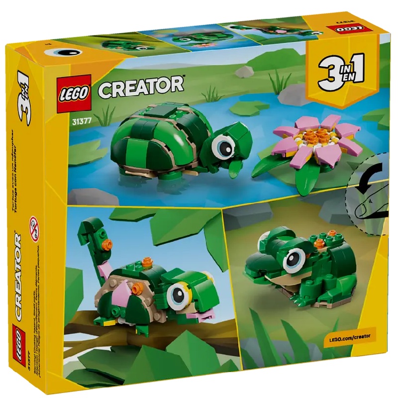 LEGO Creator 3 in 1 Turtle with a Water Lily Flower (31377) building set lets kids ages 7 and up play out creative animal stories. This cute animal toy for girls and boys offers 3 different building options with the same set of bricks. Kids can choose to build a turtle toy with a posable head and mouth, which comes with a beautiful pink water lily flower. This can then be rebuilt into a chameleon lizard toy with a posable head and tail, or a frog toy with a moving mouth. Once playtime is over, each model can be displayed as fun room decor. This LEGO Creator 3 in 1 set will inspire kids’ imaginations and makes a great value cute gift for girls and boys who love pretend play and wild animals. And with the LEGO Builder app, kids will experience an easy and intuitive building adventure. They can zoom in and rotate their sets using 3D building instructions, track their progress and save them in one place. Please note models cannot be built simultaneously. Set contains 124 pieces.Specifications