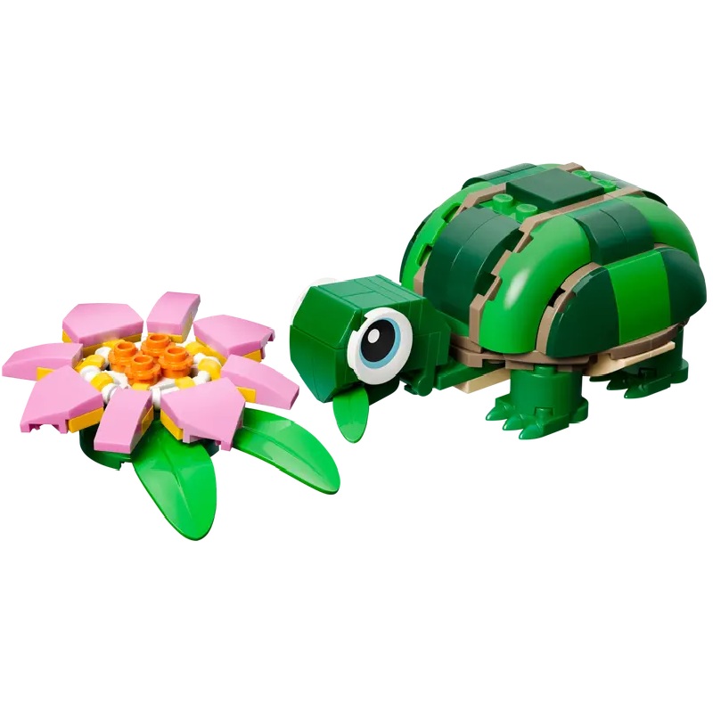 Kids enjoy creative stories with 3 wild animal toys (models cannot be built simultaneously): a turtle toy with a pink flower, a chameleon or a frog; This 124-piece LEGO animal set features a turtle toy for kids measuring over 1.5 in. (4 cm) high, 4 in. (10 cm) long and 2.5 in. (6 cm) wide
