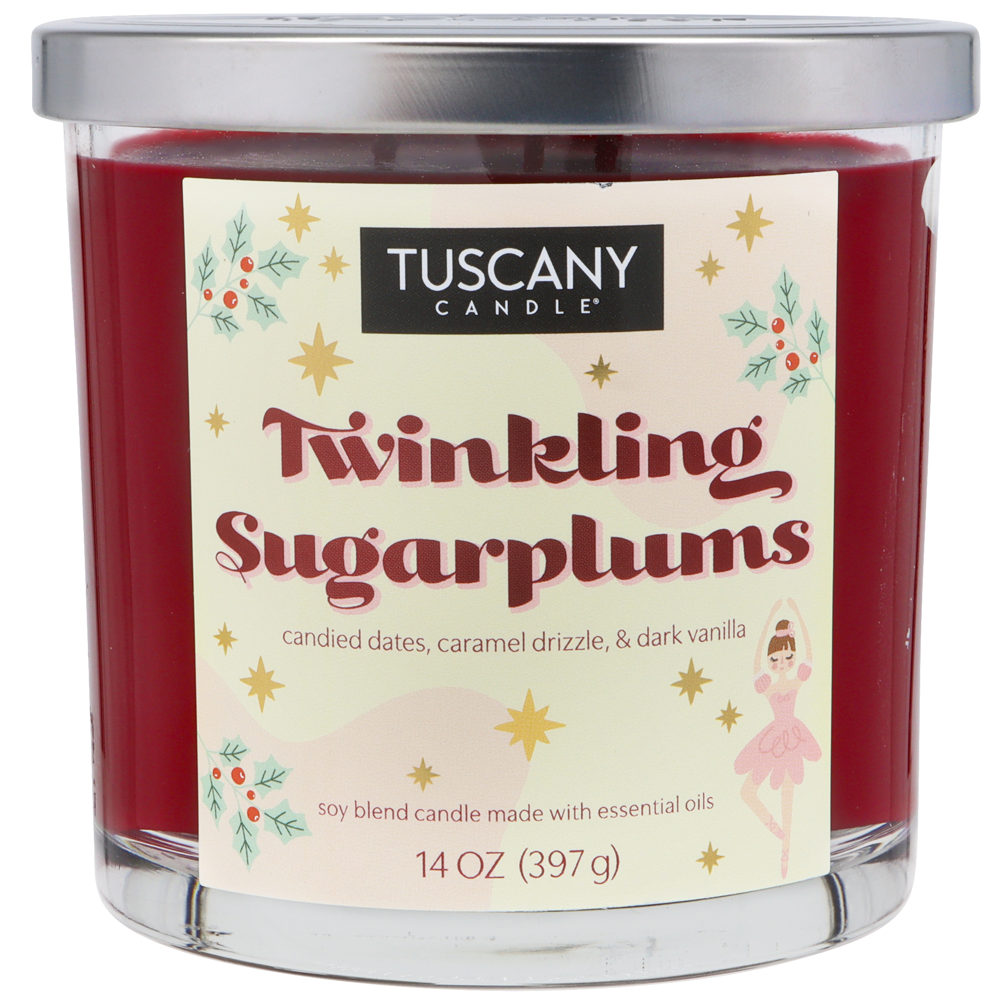 3 wicks; embosssed silver lid; made with essential oils, poured in the USA; Premium satin wax; Sugarplums and festive candied dates twirl alongside ginger, caramel, and dark vanilla