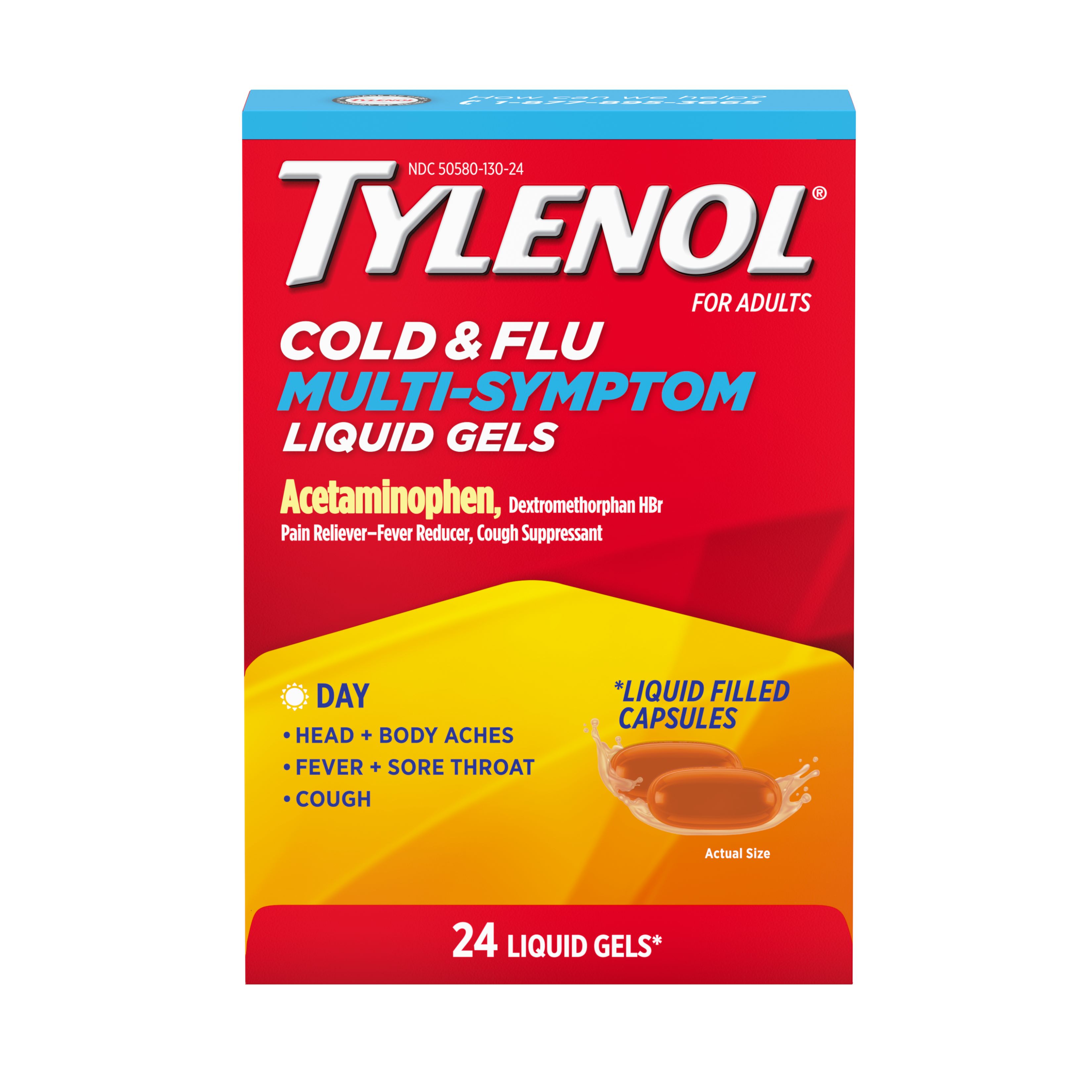 Cold and flu symptom medicine in liquid filled capsules for adults and children aged 12 and older; Helps temporarily relieve flu symptoms like head and body aches, fever, sore throat, and coughs; Tylenol Daytime Cold & Flu Multi-Symptom Liquid Gels for powerful cold + flu symptom relief