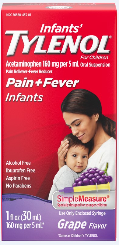 Pain Reliever-Fever Reducer. Ibuprofen Free. Alcohol Free. Aspirin Free. Simple Measure . Use Only Enclosed Syringe. Made in USA. When it comes to reducing fever or relieving pain, TYLENOL is the brand recommended most by pediatricians. Infants TYLENOL works differently than other pain and fever medicines. It also wont upset little stomachs. If your child is under 2 years of age, be sure to ask your doctor.Specifications