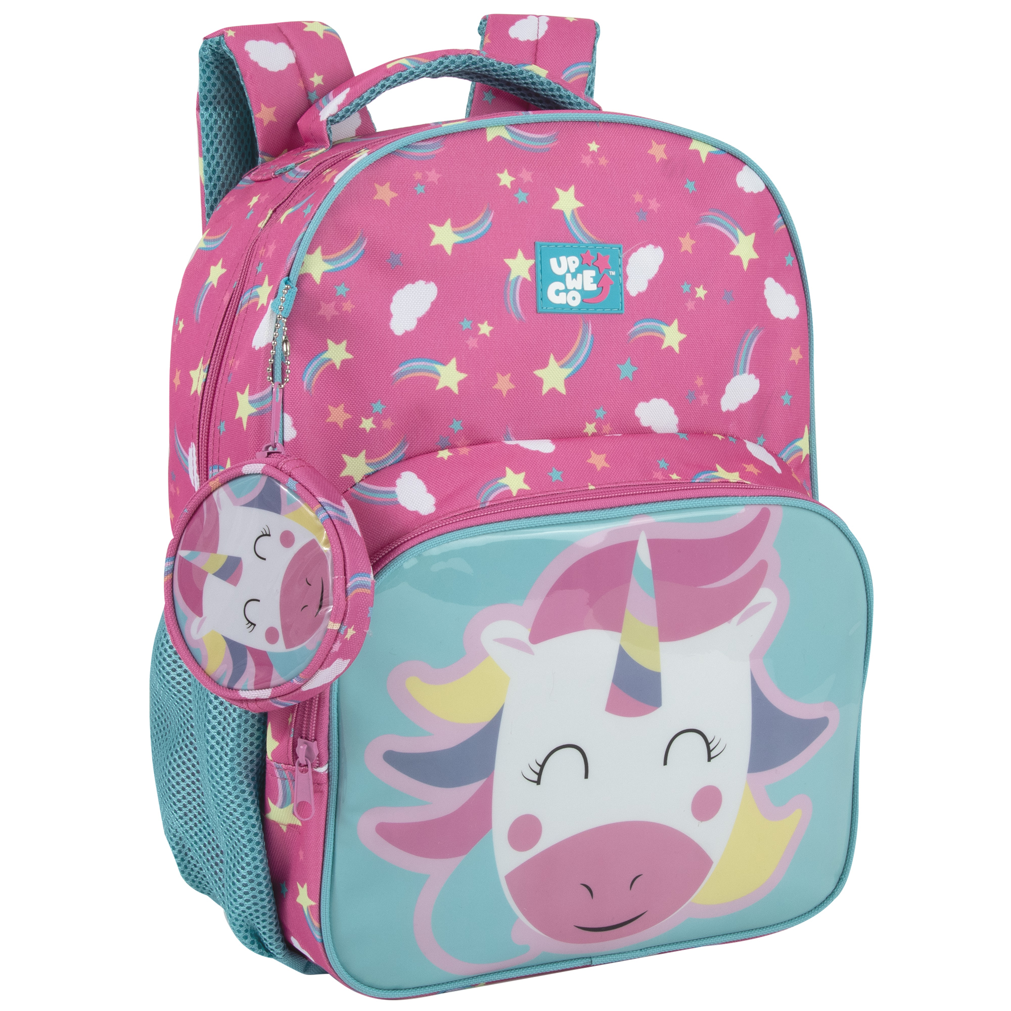 Unicorn backpack with added value coin pouch. Large front access pocket, all over print, printed back panel, air mesh underside straps, top handle, and side pocketsSpecifications