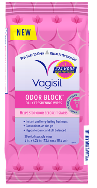 Vagisil Odor Block Daily Freshening Wipes, 20 Wipes in a Resealable Pouch. We are so over odor. Exercise, your period, little bladder leaks, and even what you eat can often be the cause of feminine odor. Just a swipe of odor block freshening wipes can help eliminate odor quickly. With patented odor block technology to help stop odor before it starts; Keeps you feeling fresh all day long.Specifications