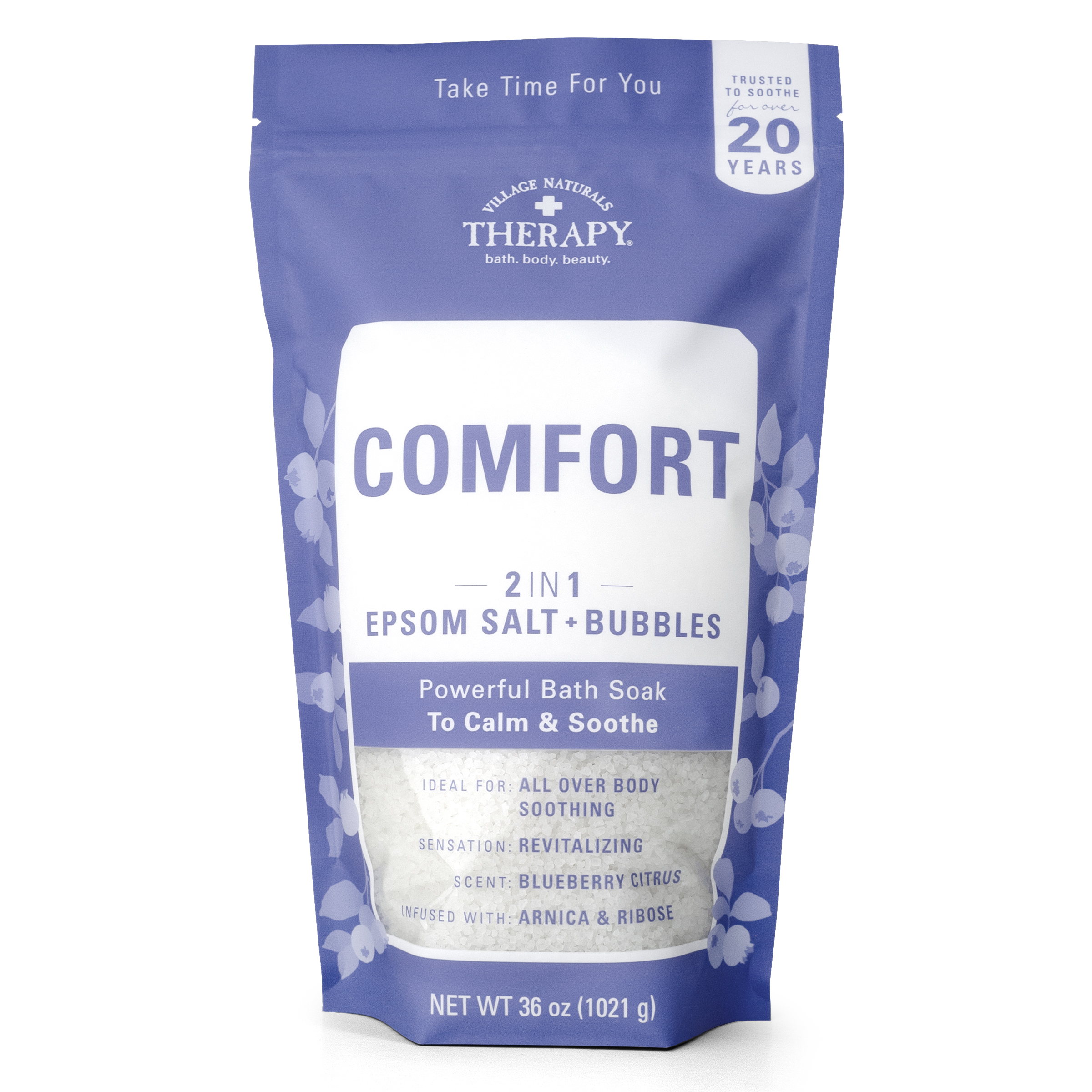 VILLAGE NATURALS COMFORT 2-IN-1 EPSOM SALT + BUBBLES BATH SOAK BLUEBERRY CITRUS 36 OZ