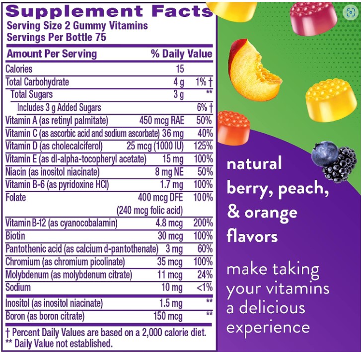 MultiVites provide a fusion of essential vitamins, minerals and natural fruit flavors in a delicious gummy. This multivitamin is formulated for adults and provides a great-tasting and convenient alternative to traditional, hard-to-swallow pills.Each serving provides:Antioxidant vitamins C and EAn excellent source of vitamins B12, B6, Folic Acid and Pantothenic AcidAs much vitamin A as one cup of broccoliAs much vitamin C as one tangerineAs much vitamin D as 5 oz. of SalmonNatural Berry, Peach & Orange flavors.Gluten FreeBiotinFolic AcidVitamin AVitamin B3Vitamin B6Vitamin B-12Vitamin CVitamin DVitamin ESpecifications