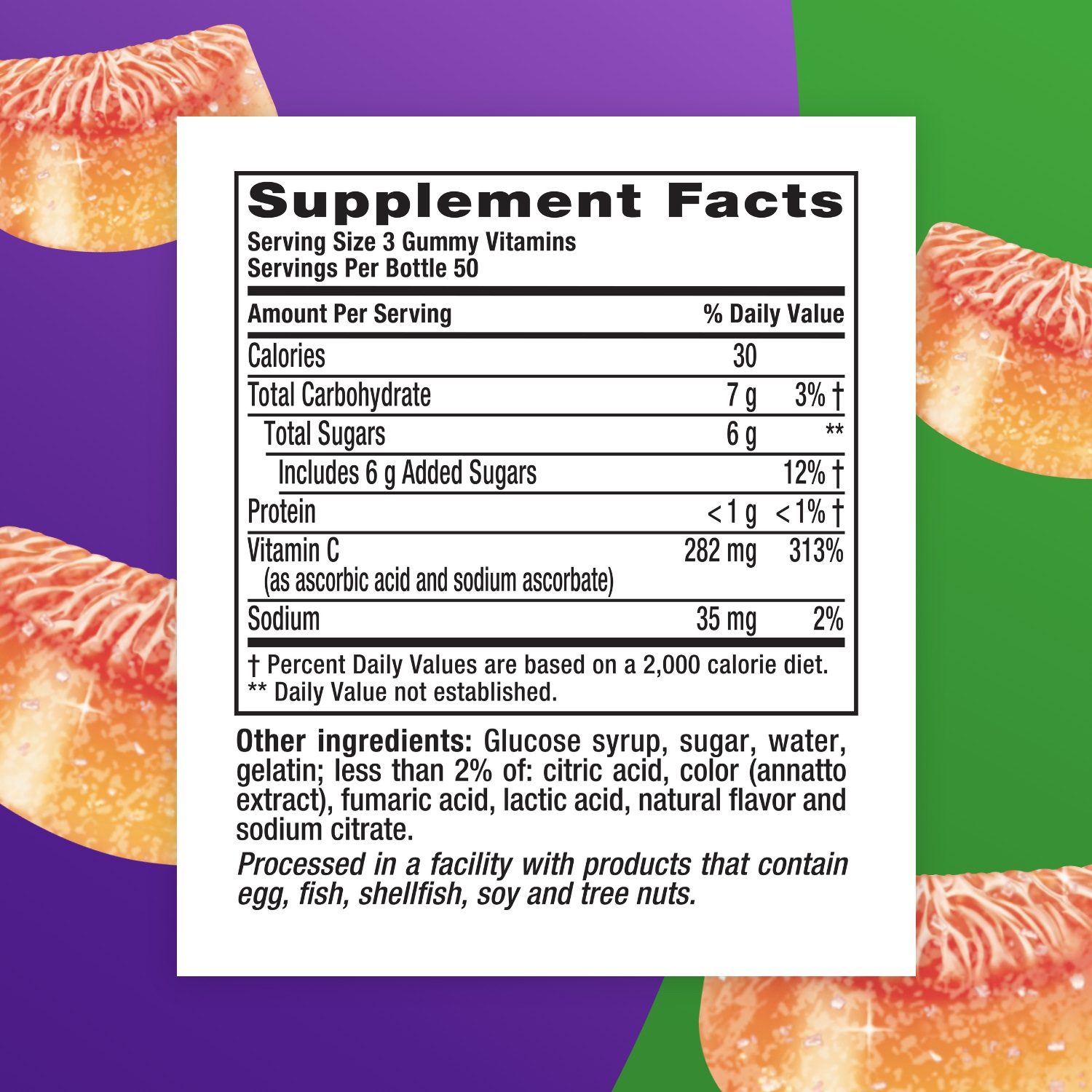 Two delicious Vitafusion Power C gummies provide an excellent source of immune supporting vitamin C as much as 10 tangerines! You’ll enjoy the tangy orange flavor and feel good knowing that these gummy vitamins are made with natural flavor.Supports immune healthNatural Orange flavor. luten FreeSpecifications