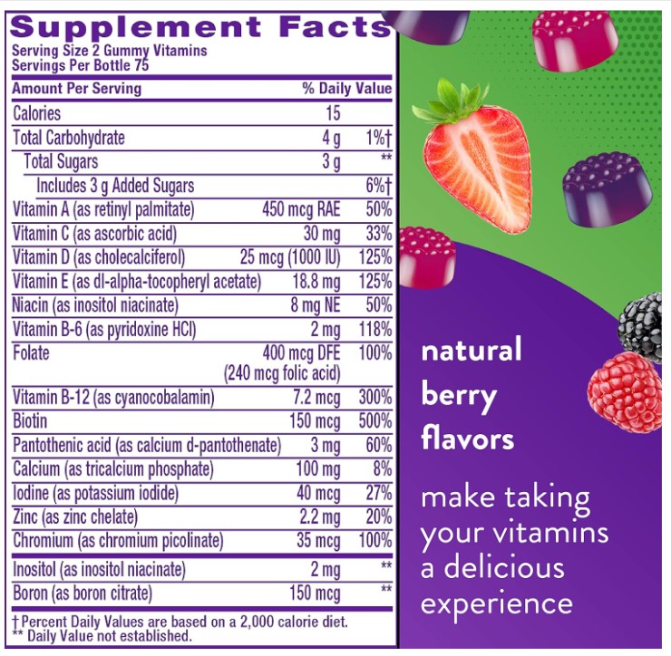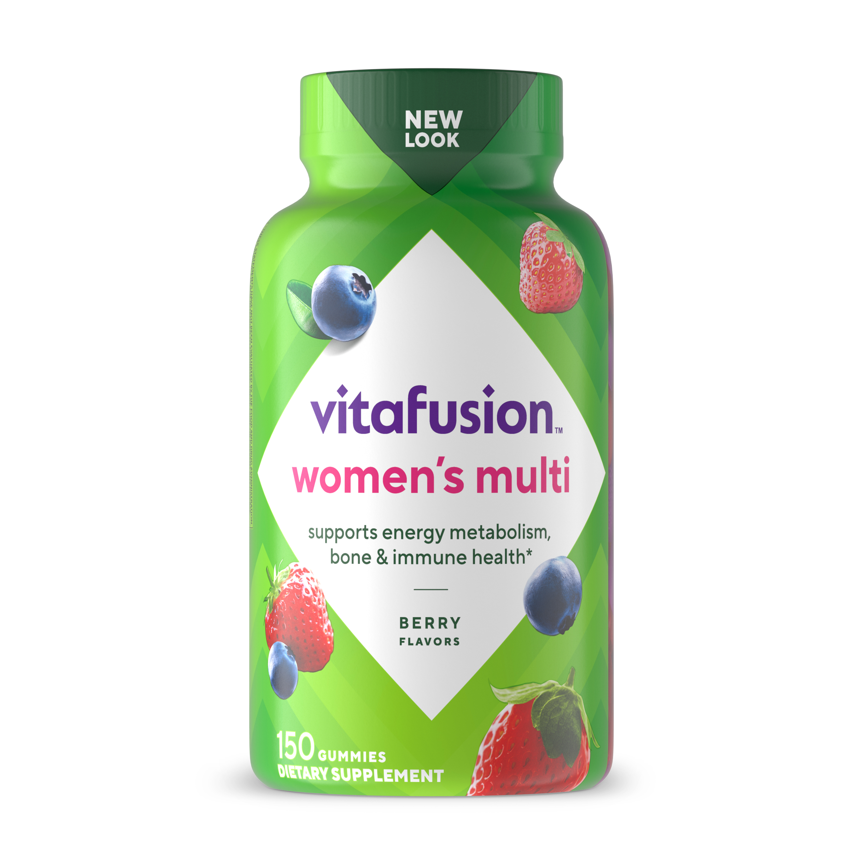 Vitafusion Women's Multivitamin gummy is a daily multivitamin formulated to address the health needs of women. These delicious gummies combine essential vitamins and minerals with natural fruit flavors.A two-gummy serving of Vitafusion Women's multivitamin:Supports energy metabolismSupports bone healthSupports immune systemSupports absorption of calciumNatural berry flavors.BiotinCalciumFolic AcidIodineVitamin AVitamin B3 Vitamin B6Vitamin B-12Vitamin CVitamin DVitamin EZincSpecifications