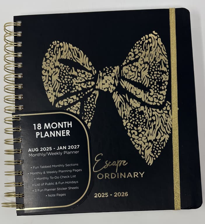 This planner keeps you organized for 18 months. Stickers and tabs are included to help keep you prepared. The print has a lovely bow print on the front that says "escape the ordinary"Specifications