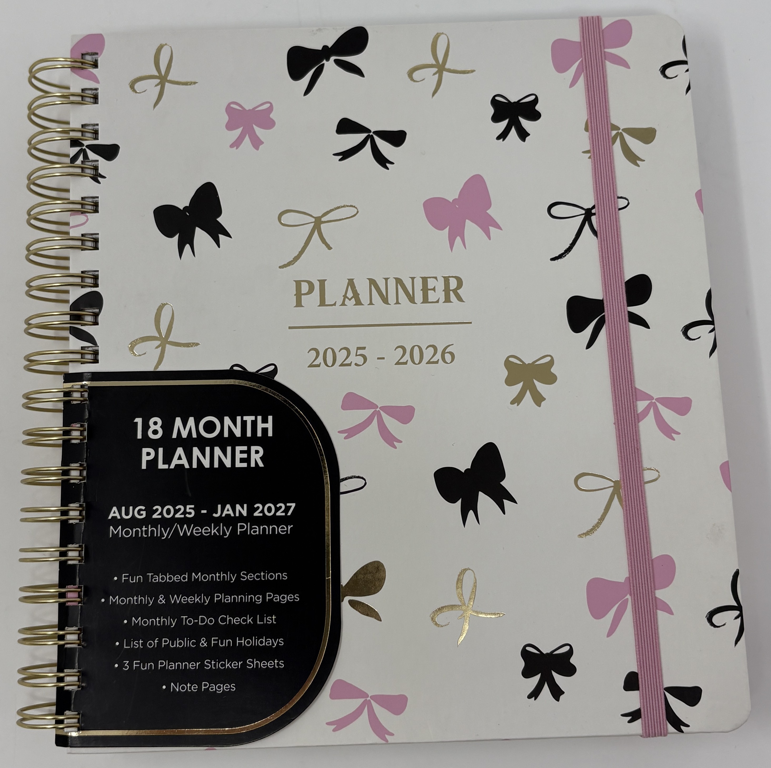 This planner keeps you organized for 18 months. Stickers and tabs are included to help keep you prepared. The Print las a lovely bow print on the frontSpecifications