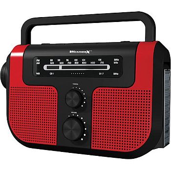 When severe weather strikes stay informed and in touch with the outside world. The Weather-X Weather band AM/FM Radio with Flashlight is a multifunctional device features weather band and AM/FM radio an LED flashlight USB port for cellular phone charging emergency siren dynamo hand crank and more AM/FM radio direct tuning Weather band LED flashlight LED lantern Emergency siren Dynamo hand-crank power Solar panel 5.5V Mobile phone charger Thermometer Carry handle Telescopic FM antenna Built-in AM antenna Analog volume control Built-in speaker LED power indicator 3.5mm audio input DC battery power: built-in rechargeable NiMH battery DC power input: requires an AC/DC power adapter DC battery power: requires 3 AA size batteries.Specifications
