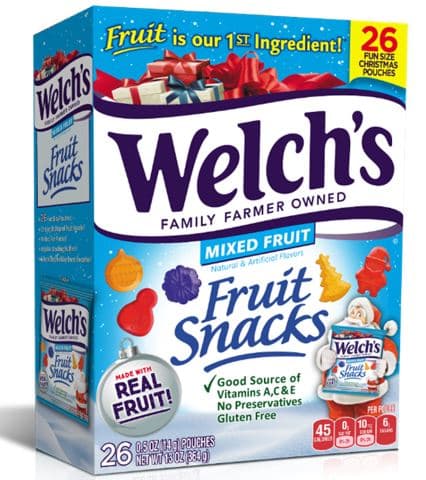 Welch's Holiday Fruit Snack come in seasonal shapes like snowman, ornament, tree, Santa, and snowflake. 26 - 0.5 oz fun sized pouches of mixed fruit snacks. Made with real fruit, fat free, gluten free, and no preservatives. Perfect for stockings, parties and classroom exchanges.Specifications