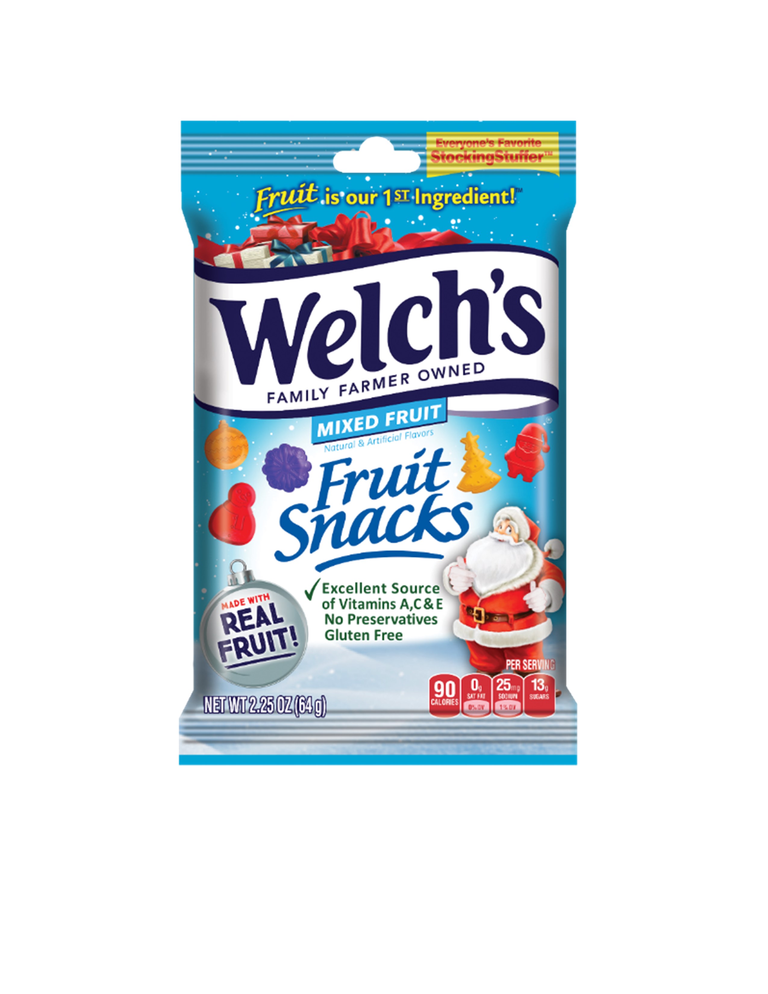 2.25 oz. bag of Welch's Fruit Snacks; Christmas Shaped Fruit Snacks; Gluten Free; Made with Real Fruit; Mixed fruits flavors include strawberry, blueberry, peach, grape and more; No Preservatives; Welch's Fruit Snacks Mixed Fruit Flavor, Christmas themed fruit shapes and graphics