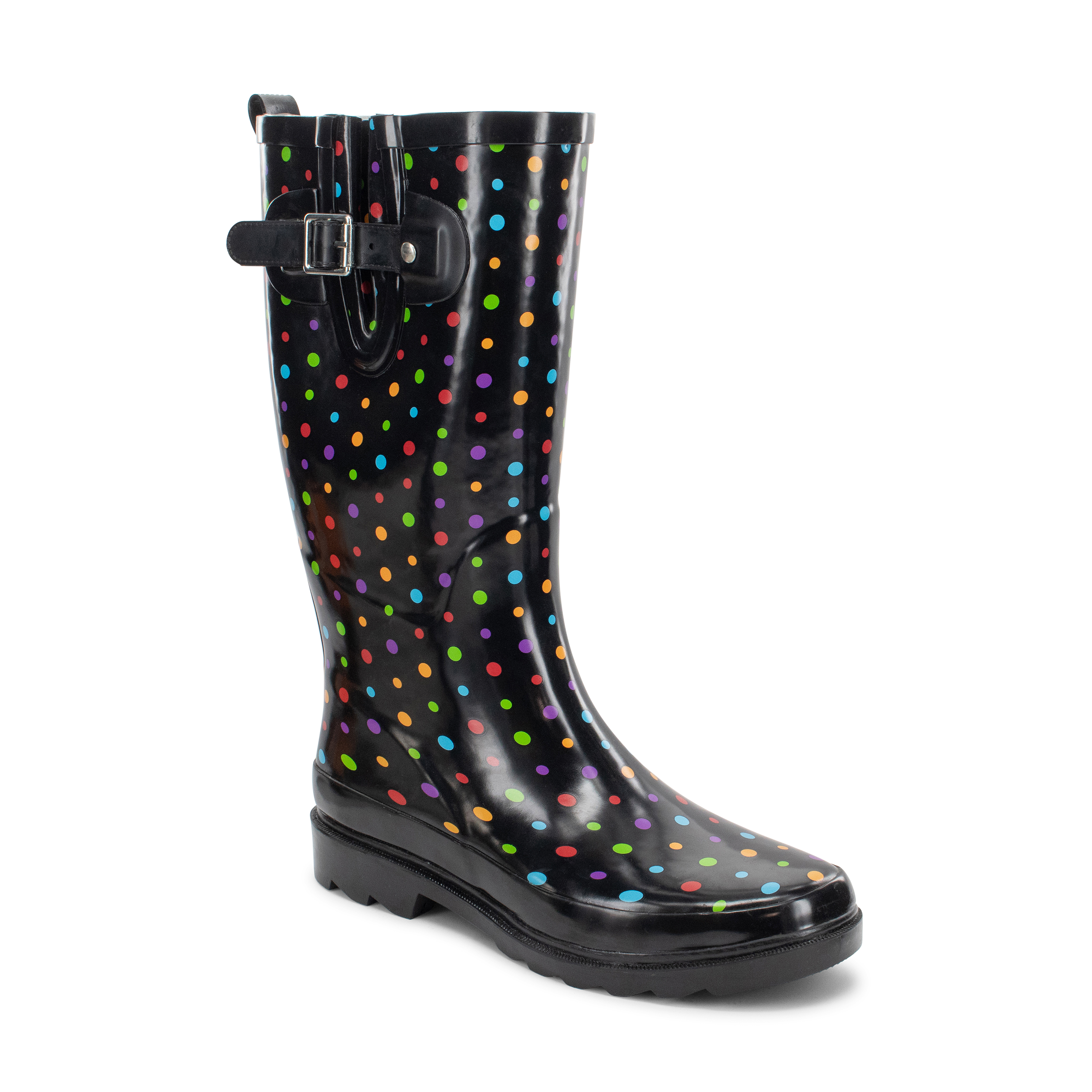 TAKE ON RAINY DAYS IN STYLE WITH THE WESTERN CHIEF WOMENS TALL RAIN BOOTS THAT FEATURE A FUN DITSY DOT PRINT. MADE FROM WATERPROOF HIGH-QUALITY RUBBER, THESE PRINTED RAIN BOOTS FEATURE A SOFT POLYESTER/COTTON LINING FOR COMFORT AND BREATHABILITY. THE REMOVABLE EVA INSOLE AND RUBBER LUG OUTSOLE PROVIDE LASTING SUPPORT AND TRACTION, WHILE THE LATERAL GUSSET WITH AN ADJUSTABLE BUCKLE ENSURES A PERFECT FIT.