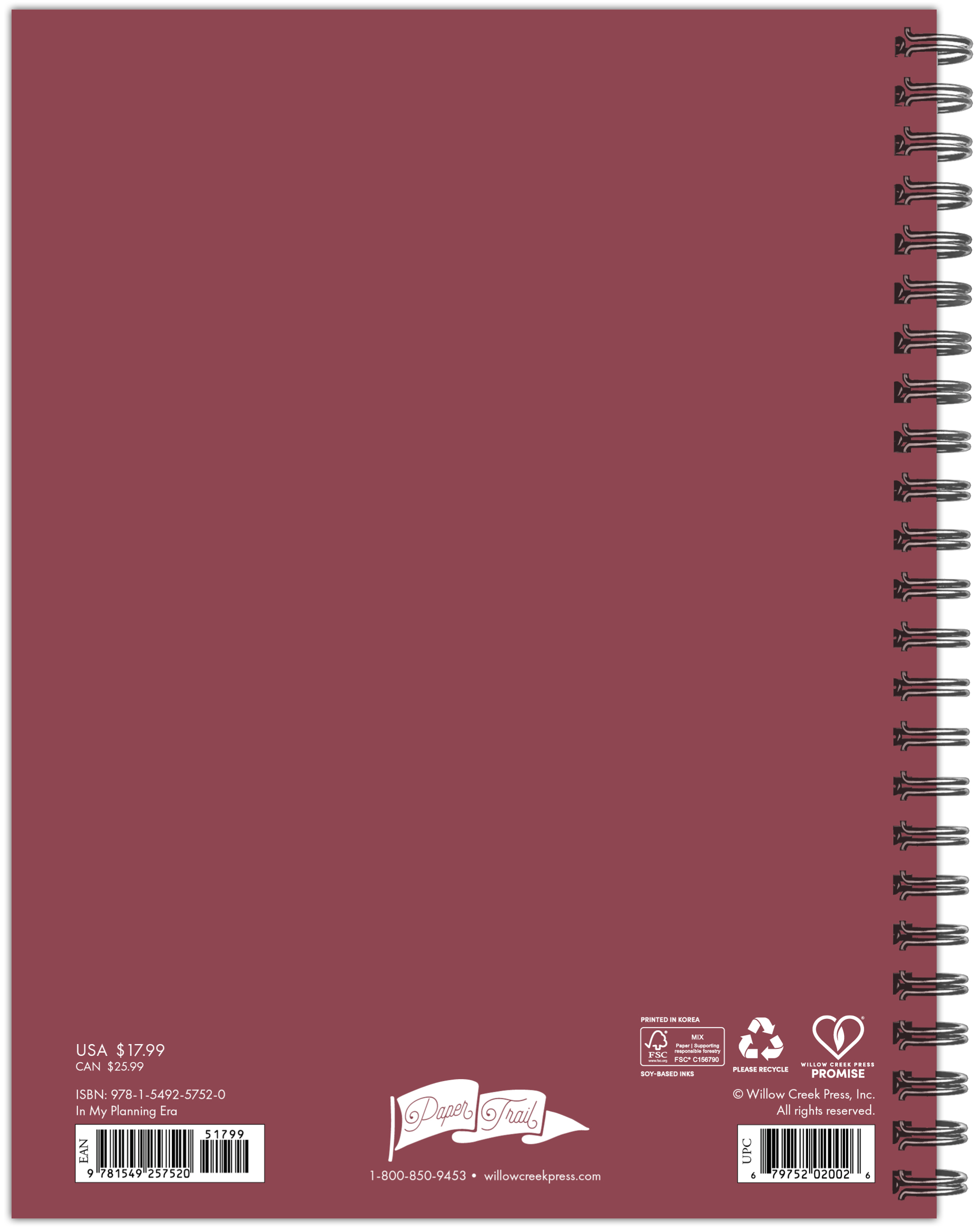 Includes a handy storage pocket offering a secure space for papers, receipts, and other important items; Includes over 300 stickers; Monthly snapshots and two-page weekly spreads; Printed with soy-based inks on high-quality FSC certified paper; Protected by a durable, plastic-free cover; Sections for weekly shopping lists, goals, and a habit tracker; Spiral binding and monthly faux tabs
