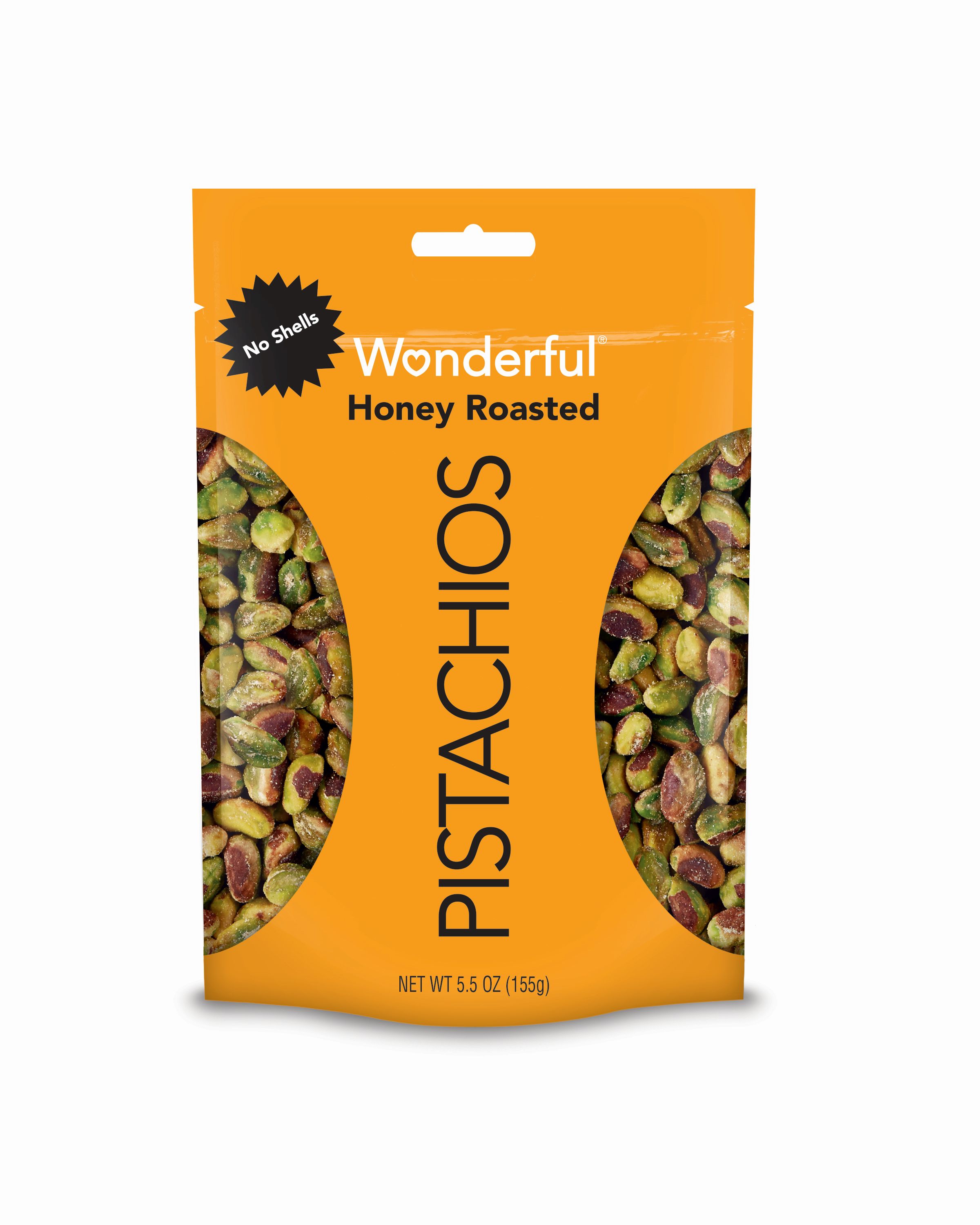 One 5.5 Ounce Resealable Pouch of our Honey Roasted Wonderful Pistachios No Shells Grab a sweet snack with Honey Roasted Wonderful Pistachios No Shells. They’re kissed with honey, sugar and a pinch of salt for a sweet and savory snack you can’t set down. Plus, we took out the shells, so it’s Less Crackin, More Snackin.Specifications