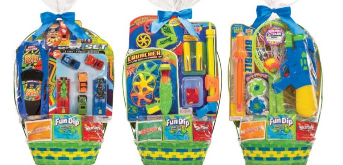 Large Easter Basket-3 girl options (Paddle game, jump rope, flying disk and sling shot; Princess Dress up jewelry and shoes; Doll, Bangles and hair extensions) and 3 boy options (large race car and 4 smaller race cars; Robot play, water blaster, flying toy; Dinosaur racers, play dinosaurs and Dinosaur grabber toy) all with 3 fun size candy bags