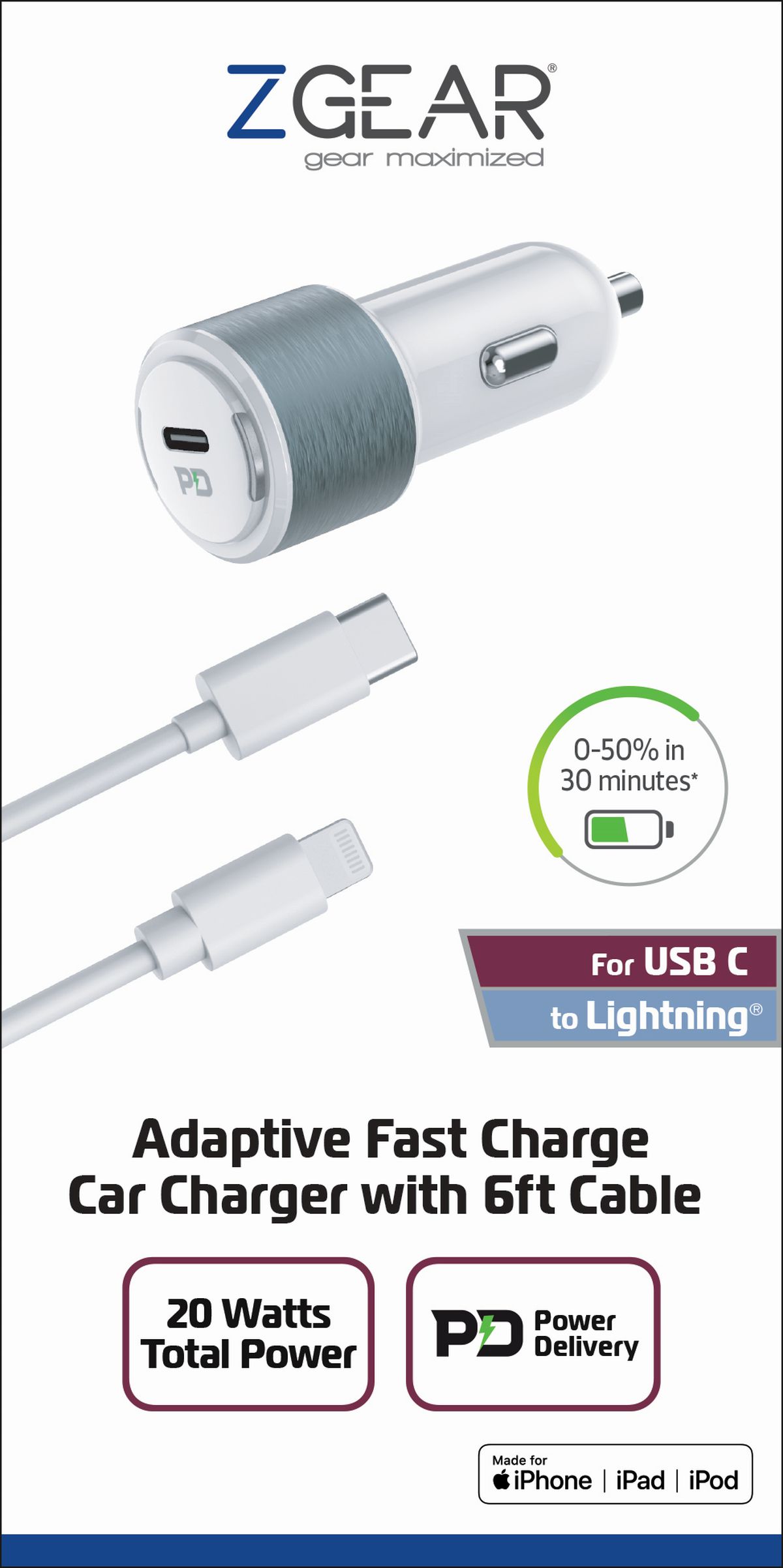 Adaptive Fast Charge Car Charger with 6ft Cable. Charges up to 4X faster. Adaptive fast charge determine & supply the fastest possible charge device allows. Preserves battery life w/overheat protection, short circuit prevention, & other advanced safety features. Up to 20W output for up to 70% faster charge than standard 5W. USB C to MFI cable allows up to 60W of power transferSpecifications