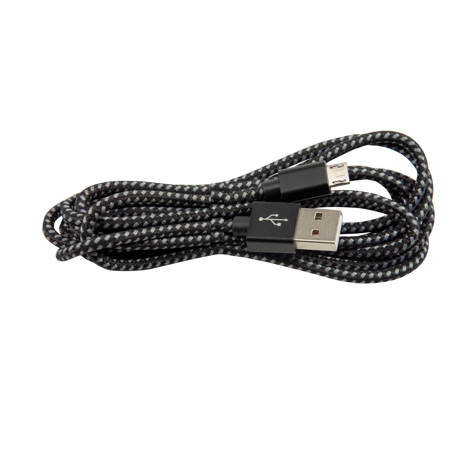 1 year limited warranty; 6 feet of cable; Braided Micro USB 6 foot Metal Tip Charge & Case friendly slim tip; Charge personal devices from any USB port; Durable tangle resistant cable; Sync Cable-Black and Grey