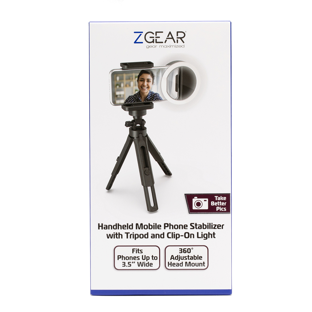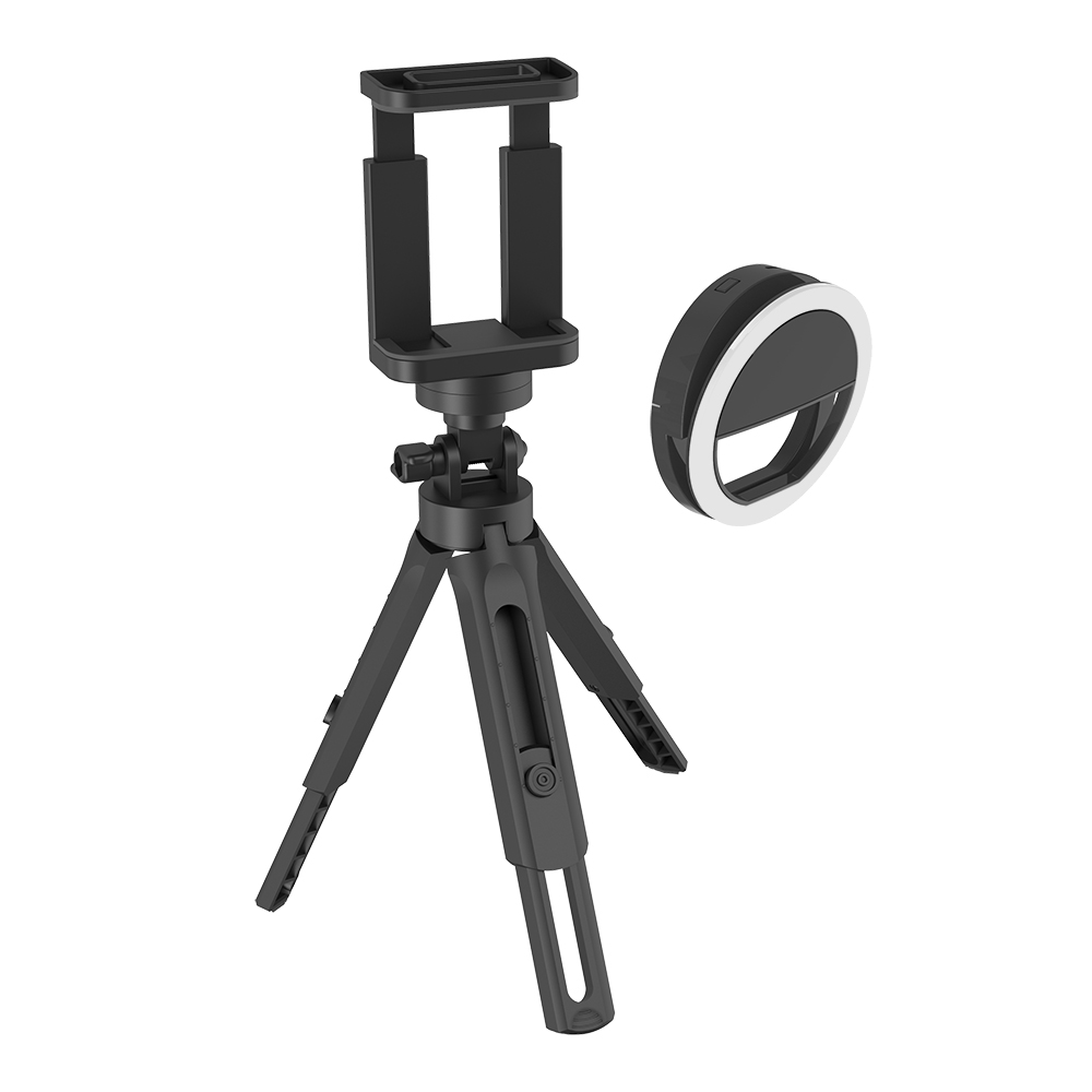 360 degree adjustable head mount; Capture photos or video from every angle; Clip-on selfie light; Fits devices up to 3.5" wide; Lightweight portable design; Mobile phone & camera holder; Supports landscape or portrait orientation; Tripod to handheld
