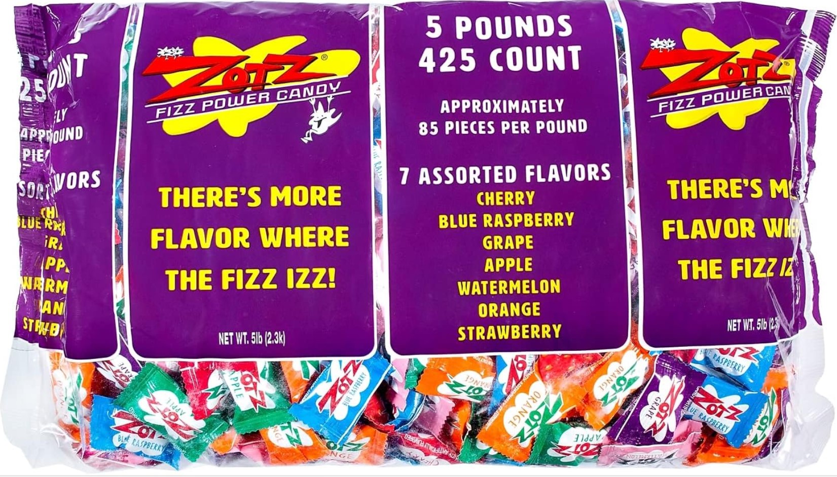 ENJOY DELICIOUS FRUIT FLAVORS WITH THIS GREAT TASTING FIZZY CANDY. ZOTZ FIZZ POWER CANDIES ARE INDIVIDUALLY WRAPPED WITH FLAVORS THAT INCLUDE CHERRY, BLUE RASPBERRY, GRAPE, APPLE, WATERMELON AND ORANGE THIS ZOTZ ASSORTMENT IS SURE TO PLEASE SO GRAB A HANDFUL AND TRY EVERY FLAVOR.Specifications
